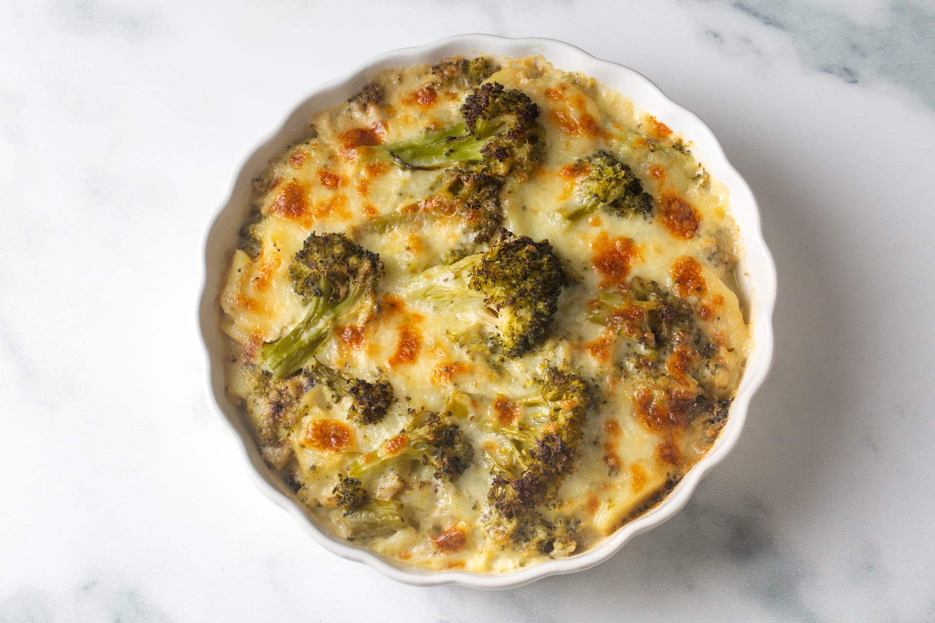 Картофите се обелват и нарязват на едри кубчета. Сваряват се за около 10 минути. Броколите се разделят на големи розички и се сваряват за около 4-5 минути. След това зеленчуците се отцеждат от водата и се подреждат в тавичка за печене.