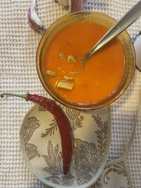 Необходими продукти: 1 глава лук 3-4 средно големи картофа 1-2 моркова 1 чушка 1 с.л. червен пипер 1 ч.л. млян кимион 1-2 с.л. куркума 4 с.л. шарлан сол на вкус…