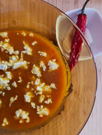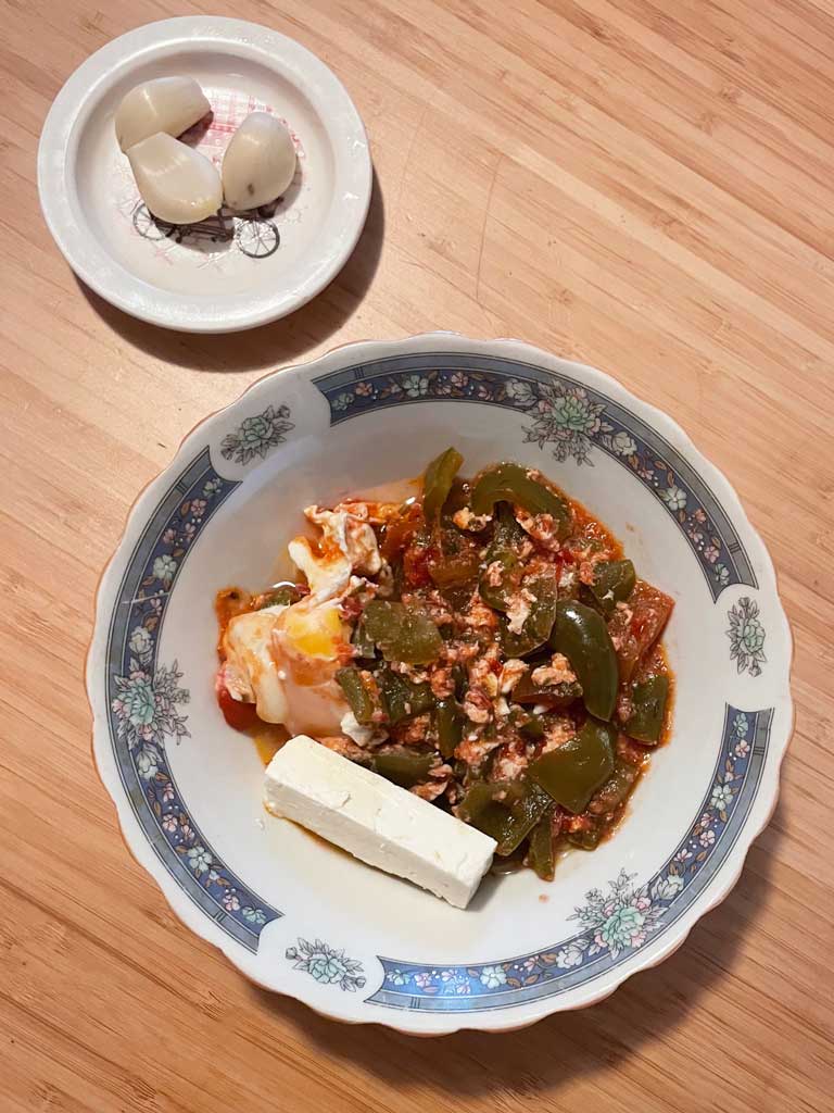 Необходими продукти: 5-6 големи зелени чушки 4 средно големи домата 4-6 яйца 6-7 супени лъжици олио 1 чаена лъжица куркума сол на вкус натрошено краве сирене за гарниране Начин на…