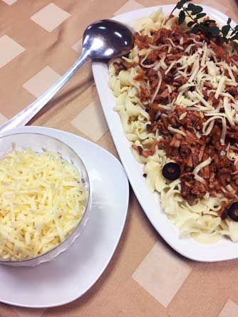 Необходими продукти: 250 гр. макарони 200 гр. шунка от бут 1 глава кромид лук 30 гр. доматено пюре 250 гр. пресни гъби 70 гр. прясно краве масло 100 гр. настърган…