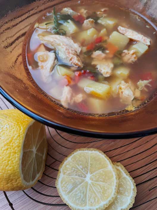 Необходими продукти: 250 гр. изчистена сьомга /2-3 парчета рагу/ 1 глава кромид лук 3-4 средно големи картофа 1-2 чушки /аз съм сложила червени/ 1-2 моркова 1 стрък целина сол на…